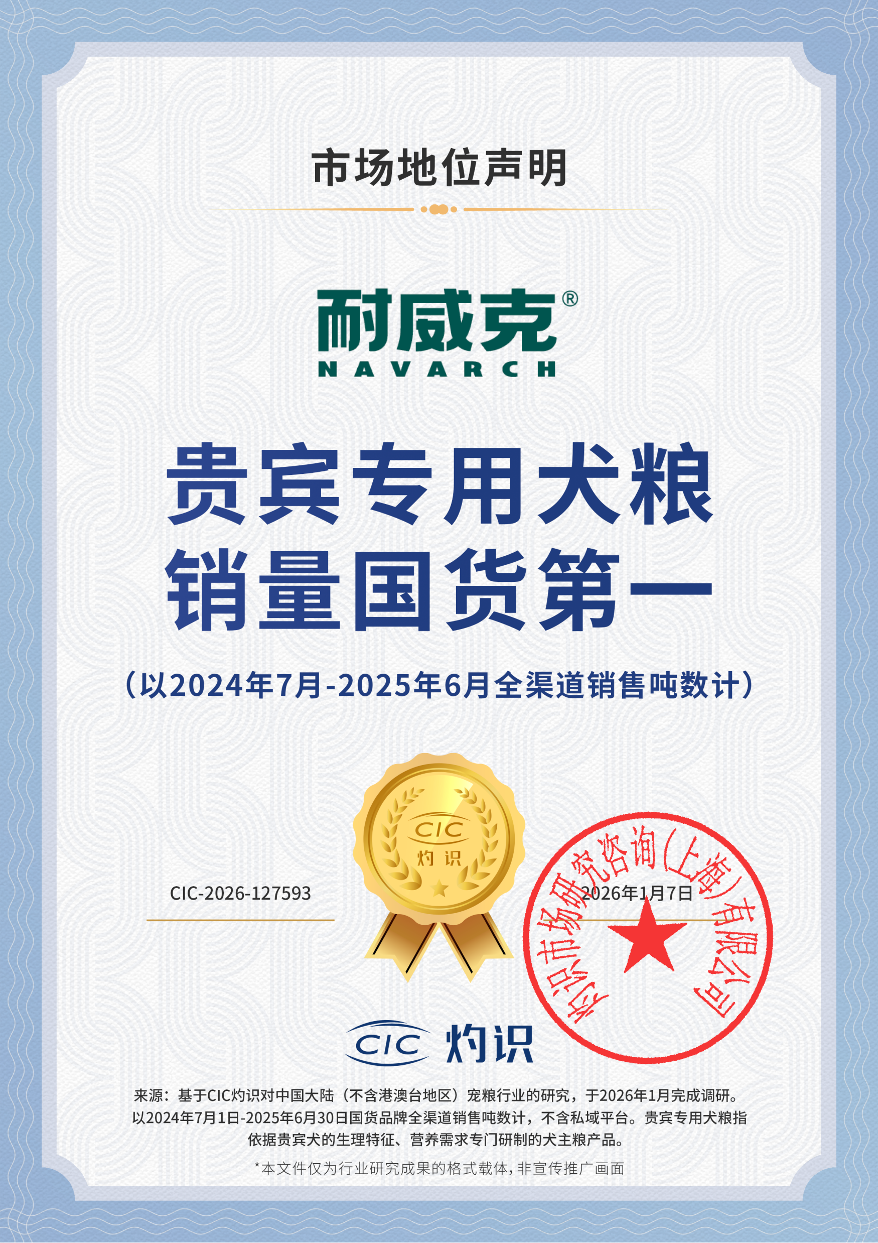 CIC 灼識確認耐威克“貴賓專用犬糧銷量國貨第一(以2024年7月-2025年6月全渠道銷噸數計)”、“綠茶貓砂五年累計銷量第一(以2020年7月-2025年6月全渠道銷售噸數計)”的市場地位。