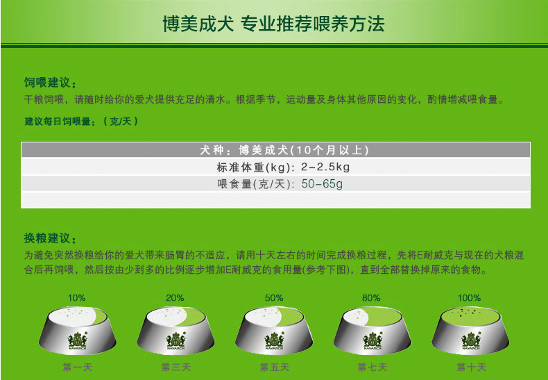 干糧飼喂,請隨時給您的愛犬提供充足的清水。根據季節、運動量及身體其他原因的變化,酌情增減喂食量。